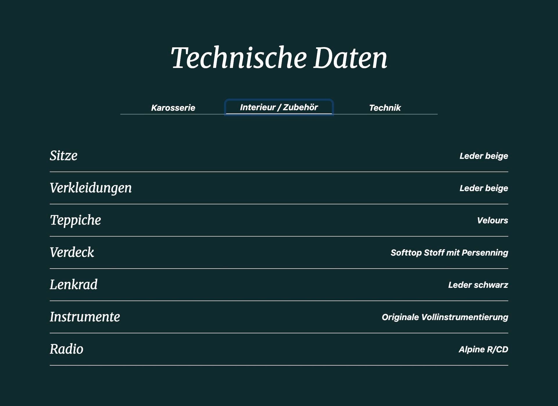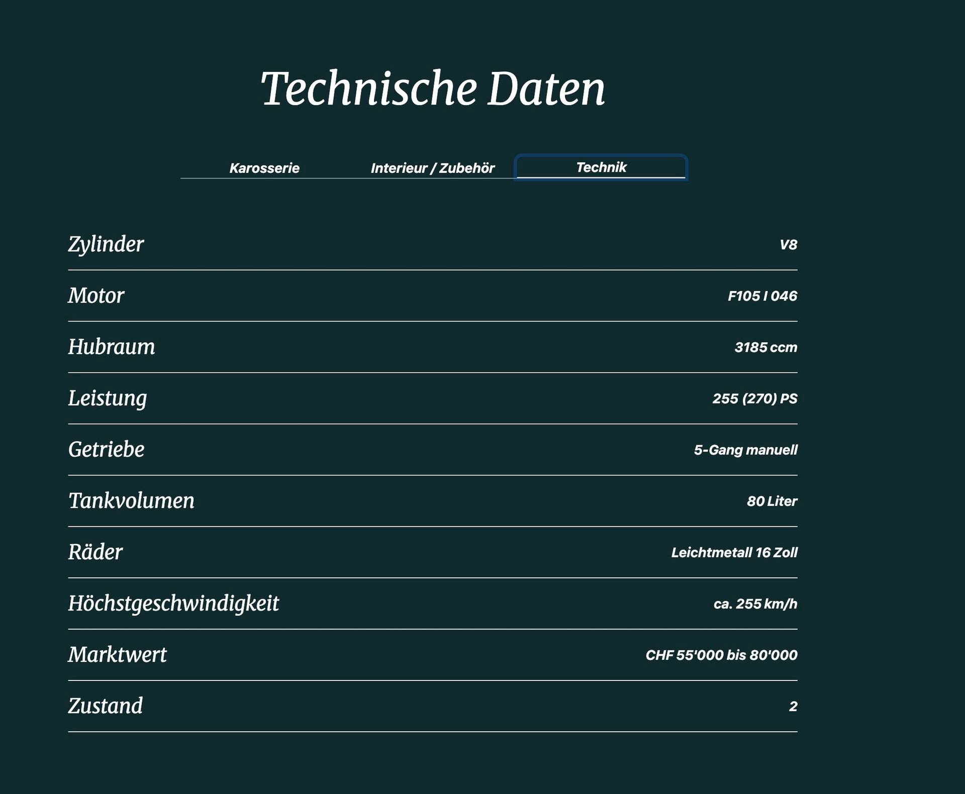Die Karosserie besticht durch hervorragende Qualität und einen makellosen Lack. Das Interieur ist original und in sehr gepflegtem Zustand. Dank der geringen Laufleistung ist die Lederqualität weiterhin hochwertig. Unterboden, Fahrwerk und Bremsen sind unversehrt und in sehr gutem Zustand. Regelmässige Inspektionen sind lückenlos im originalen Serviceheft von 1987 bis 2021 dokumentiert.