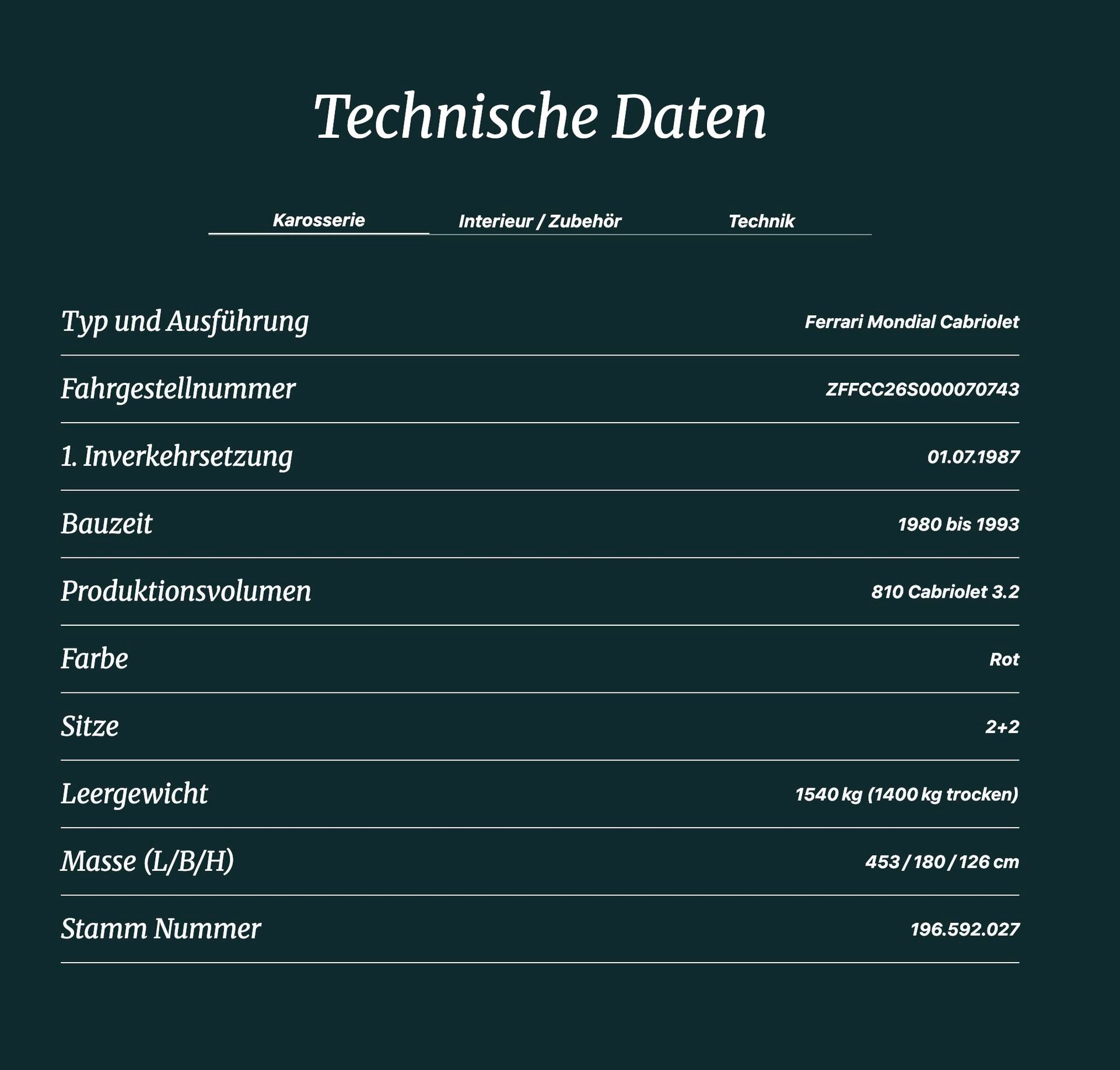 Dieser Ferrari Mondial 3.2 Cabriolet gehört zur Serie, die zwischen 1985 und 1989 entstanden ist. Er wurde am 4. Juli 1987 im Fürstentum Liechtenstein ausgeliefert und von seinem Erstbesitzer 20 Jahre lang als genussvolles Fahrzeug gefahren. Ein Kenner aus der Ostschweiz übernahm ihn danach in seine Sammlung und verkaufte ihn 2021 zurück nach Liechtenstein.