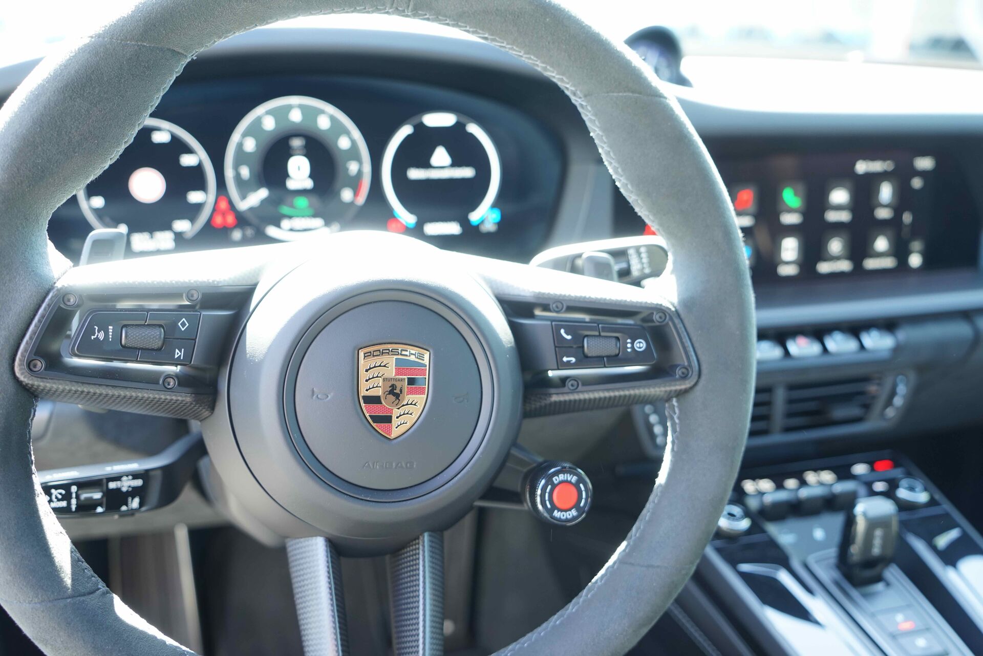 Der Porsche 911 GTS ist ein Gefährte, der sich jeder Laune anpasst und sofort parat ist, Spass zu haben. Sowas nennt man Freundschaft. Und die baut sich sofort auf, wenn man in der Kommandozentrale Platz nimmt. Ein bisschen Race-Tex hier, Alcantara dort, Leder mit Sichtnaht, alles feinstens verarbeitet, qualitativ hochwertig – Porsche halt. Zum ersten Mal allerdings ohne vorbereiteten Schlüssel, sondern Keyless. Ein bisschen schade ist, dass die Anzeigen jetzt alle digital sind. Ok, Boomer!